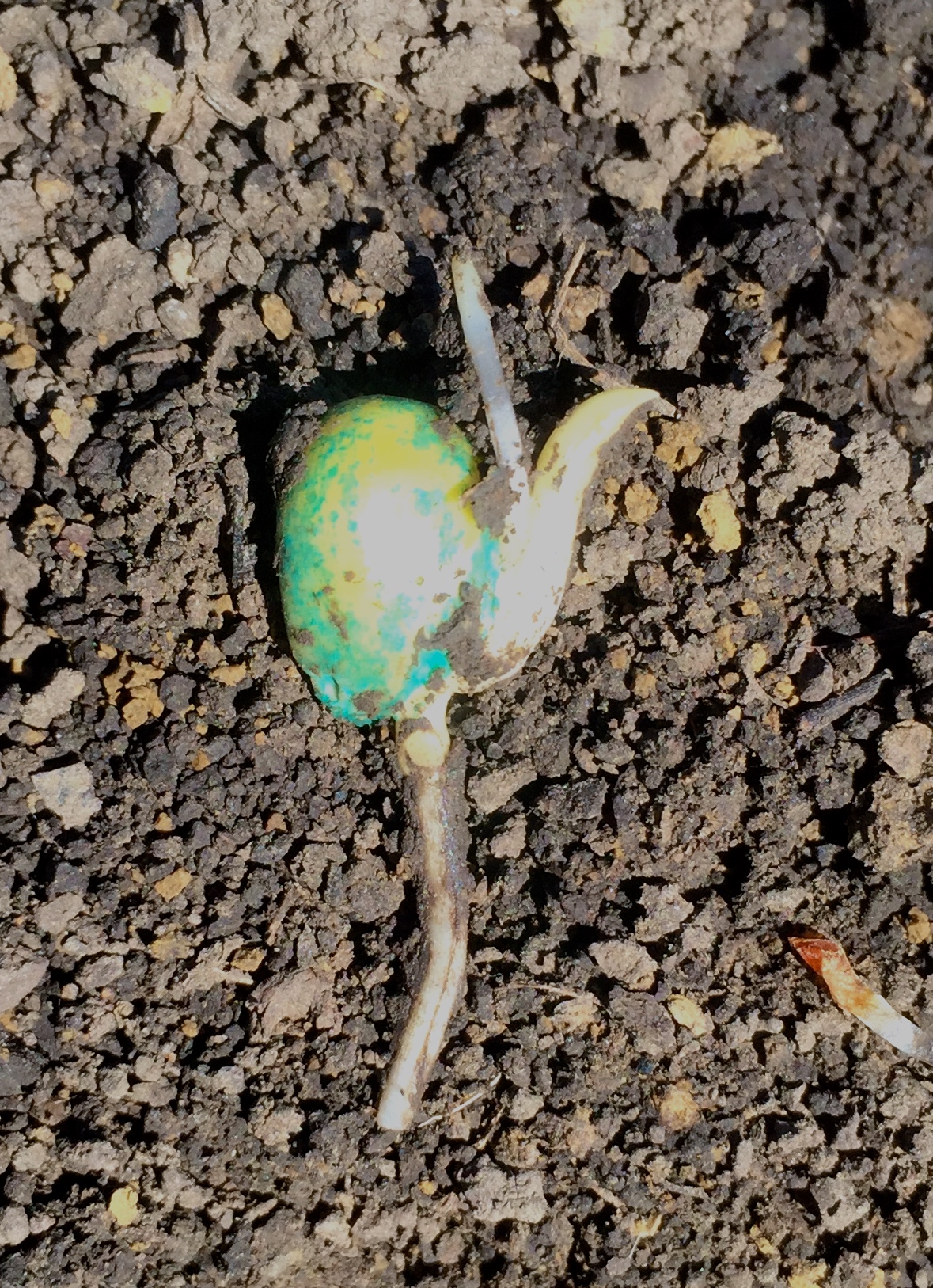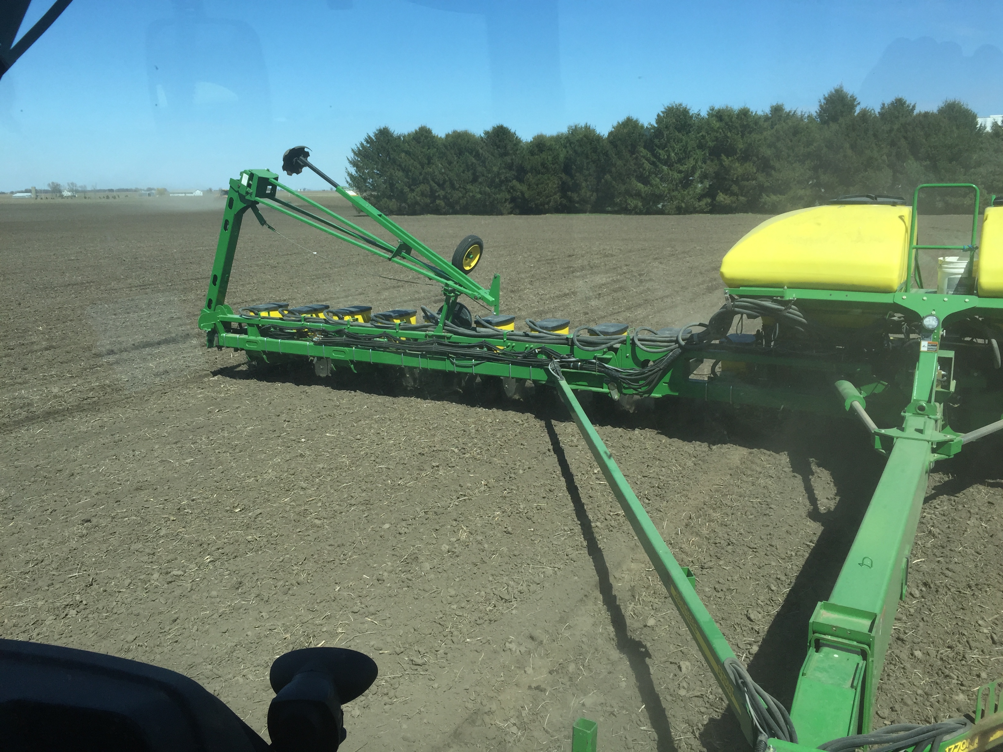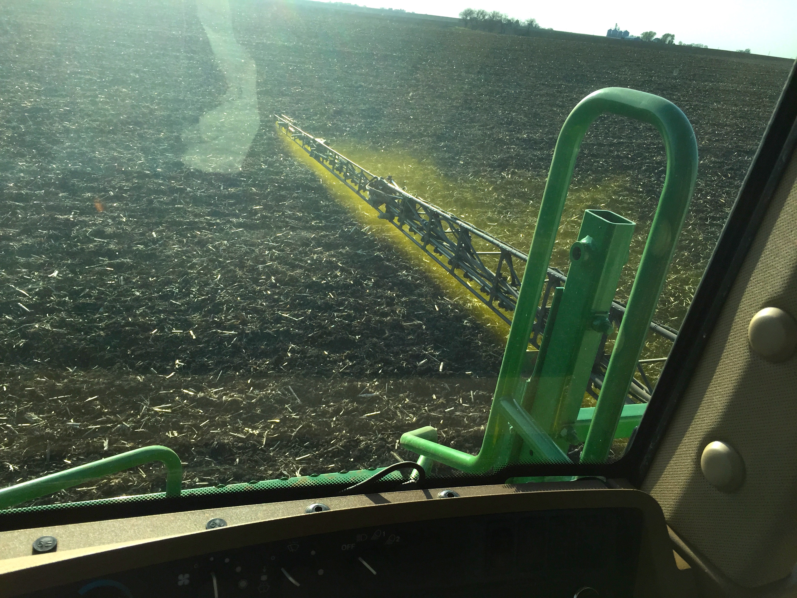 We took advantage of the warm spell on April 15-17 to plant about half of our corn crop. Seed bed conditions were ideal and we were able to get in 3 good days of planting with a couple of days of warmth following to get germination off to a good start. Pictured is a sprout on 4/20 in corn planted on 4/15. The cold weather and cold rain in the forecast this past week caused us to do very little planting. Instead, we focused on getting our preplant bean herbicide applied before the rain this weekend. The picture shows us spraying the old, bright-yellow, herbicide “Prowl” on our nonGMO bean acres. The nonGMO beans require extra preplant weed protection to compensate for the lack of effective post-emerge options. With fields drying off quickly and a great weather forecast for the week, we hope to resume planting early this week and hopefully roll right into planting beans once corn is finished.