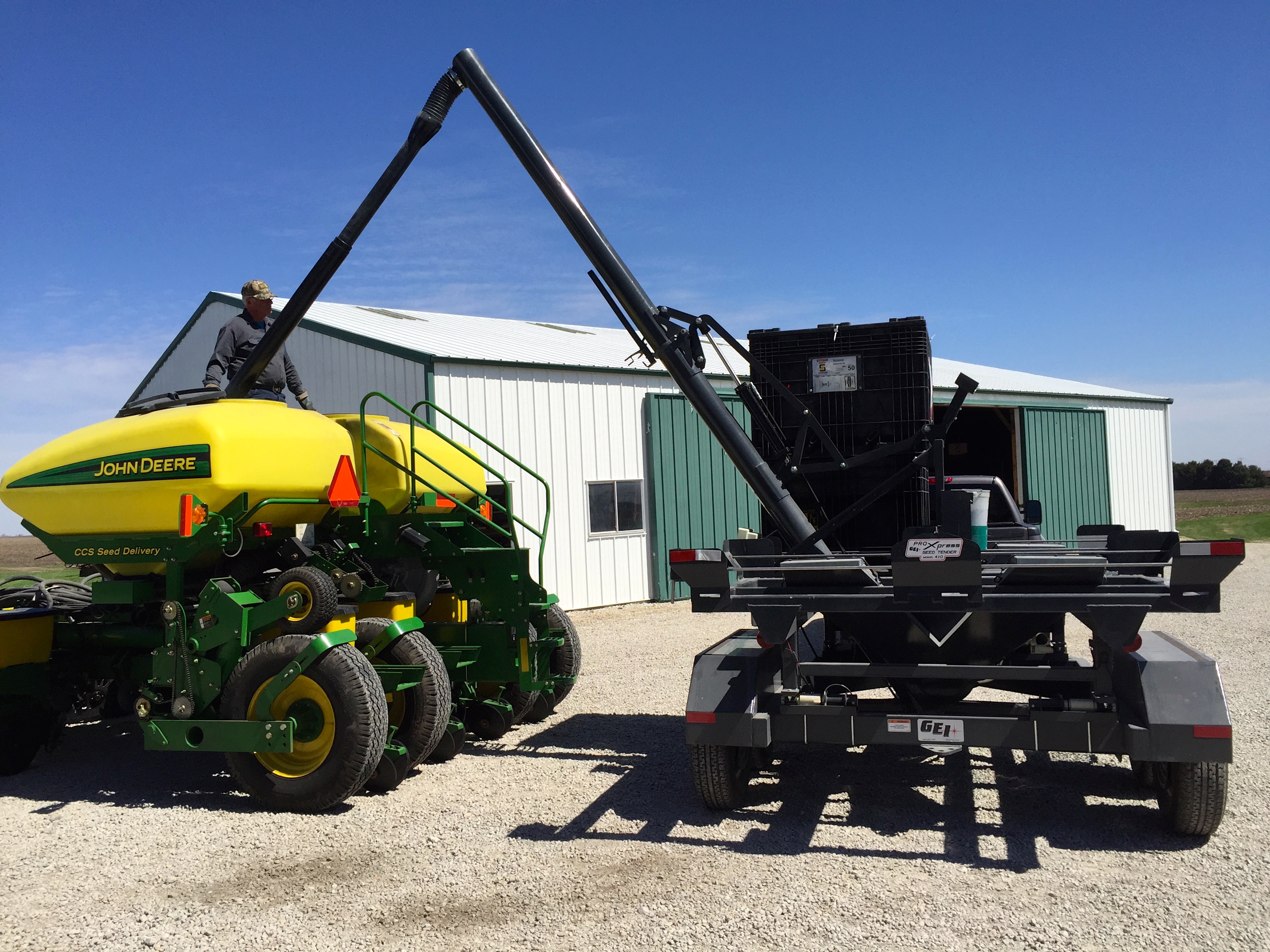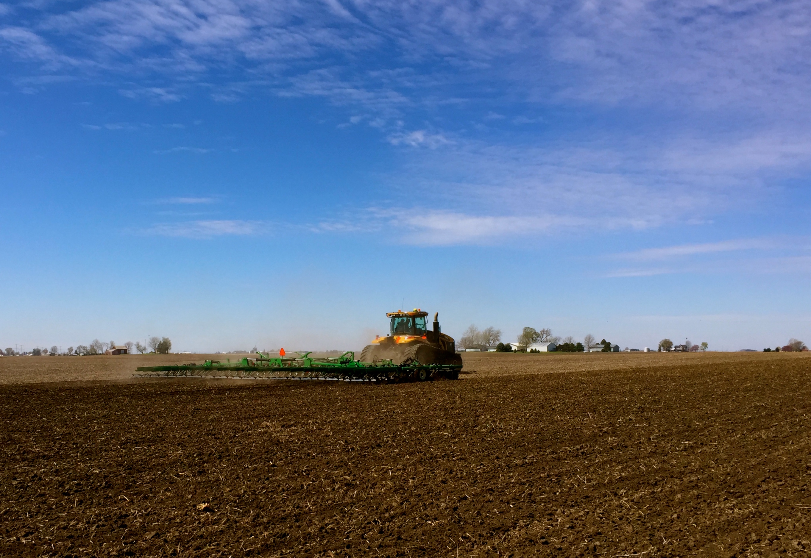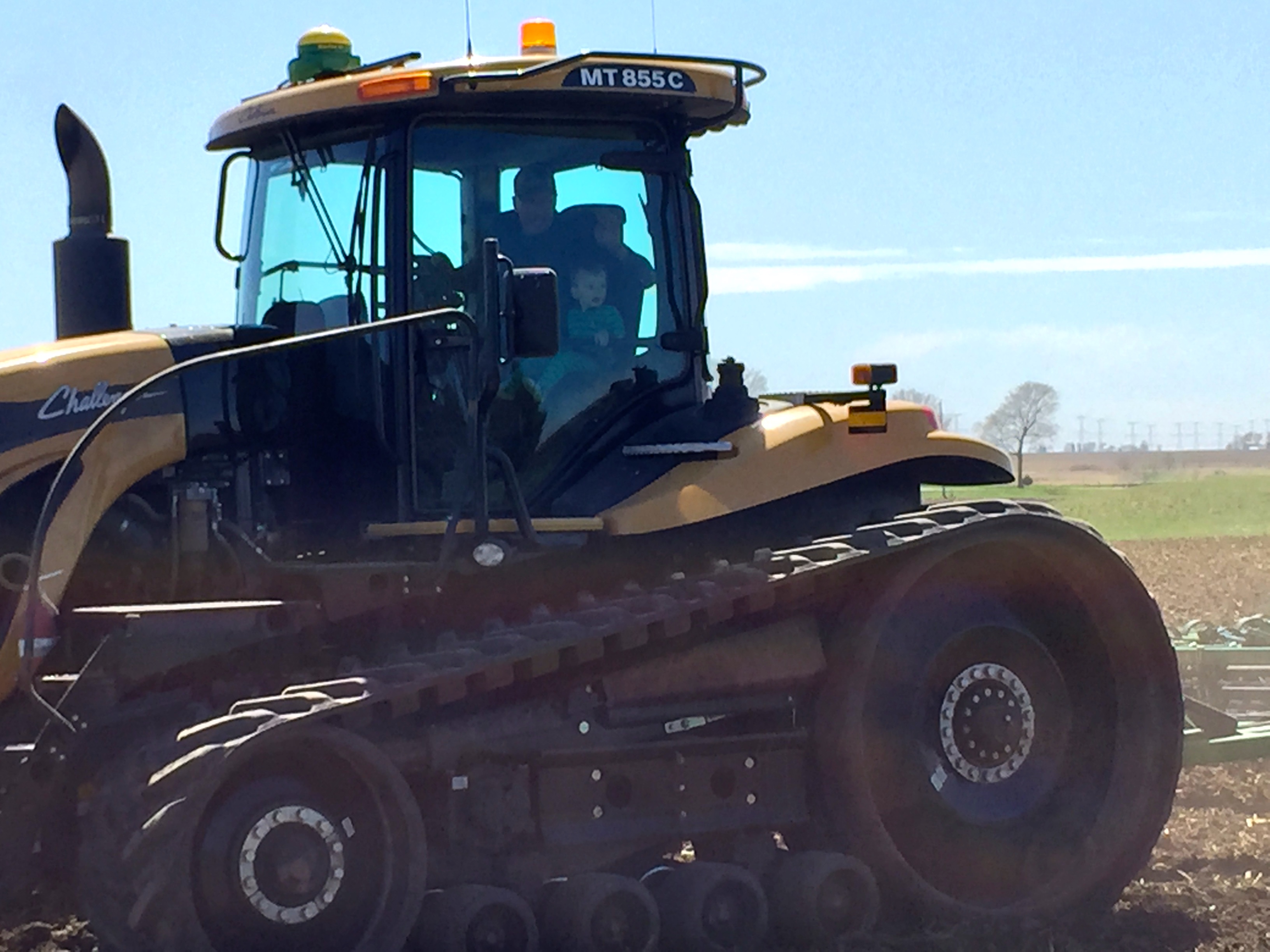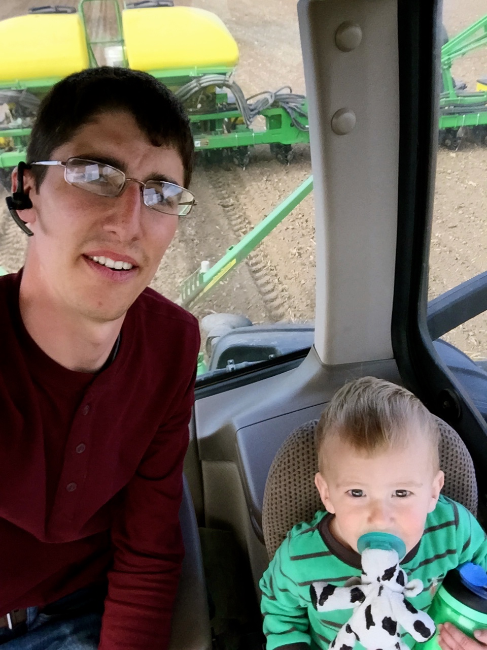 We took advantage of the warm spell on April 15-17 to plant about half of our corn crop. Seed bed conditions were ideal and we were able to get in 3 good days of planting with a couple of days of warmth following to get germination off to a good start. Pictured is a sprout on 4/20 in corn planted on 4/15. The cold weather and cold rain in the forecast this past week caused us to do very little planting. Instead, we focused on getting our preplant bean herbicide applied before the rain this weekend. The picture shows us spraying the old, bright-yellow, herbicide “Prowl” on our nonGMO bean acres. The nonGMO beans require extra preplant weed protection to compensate for the lack of effective post-emerge options. With fields drying off quickly and a great weather forecast for the week, we hope to resume planting early this week and hopefully roll right into planting beans once corn is finished.
