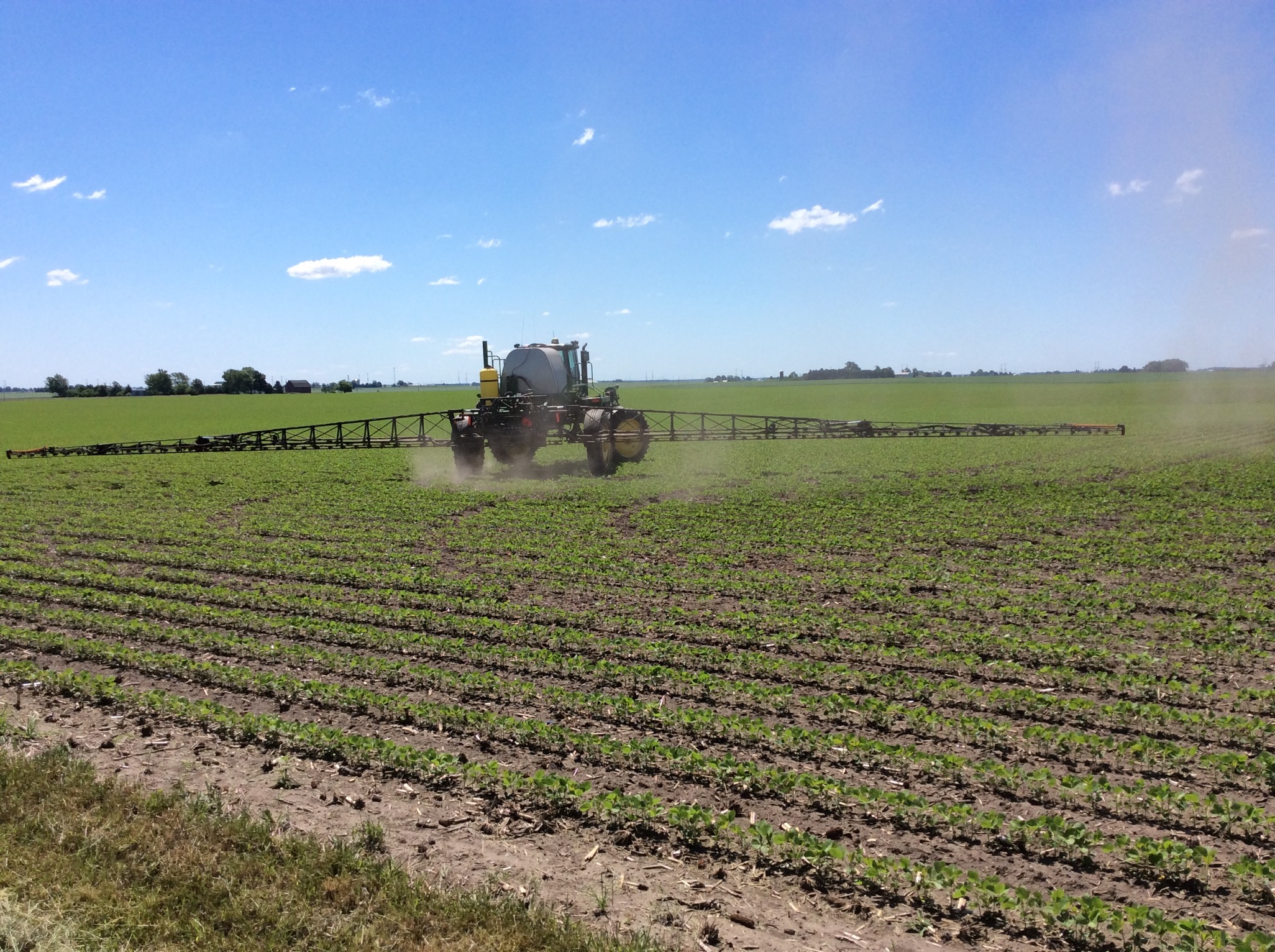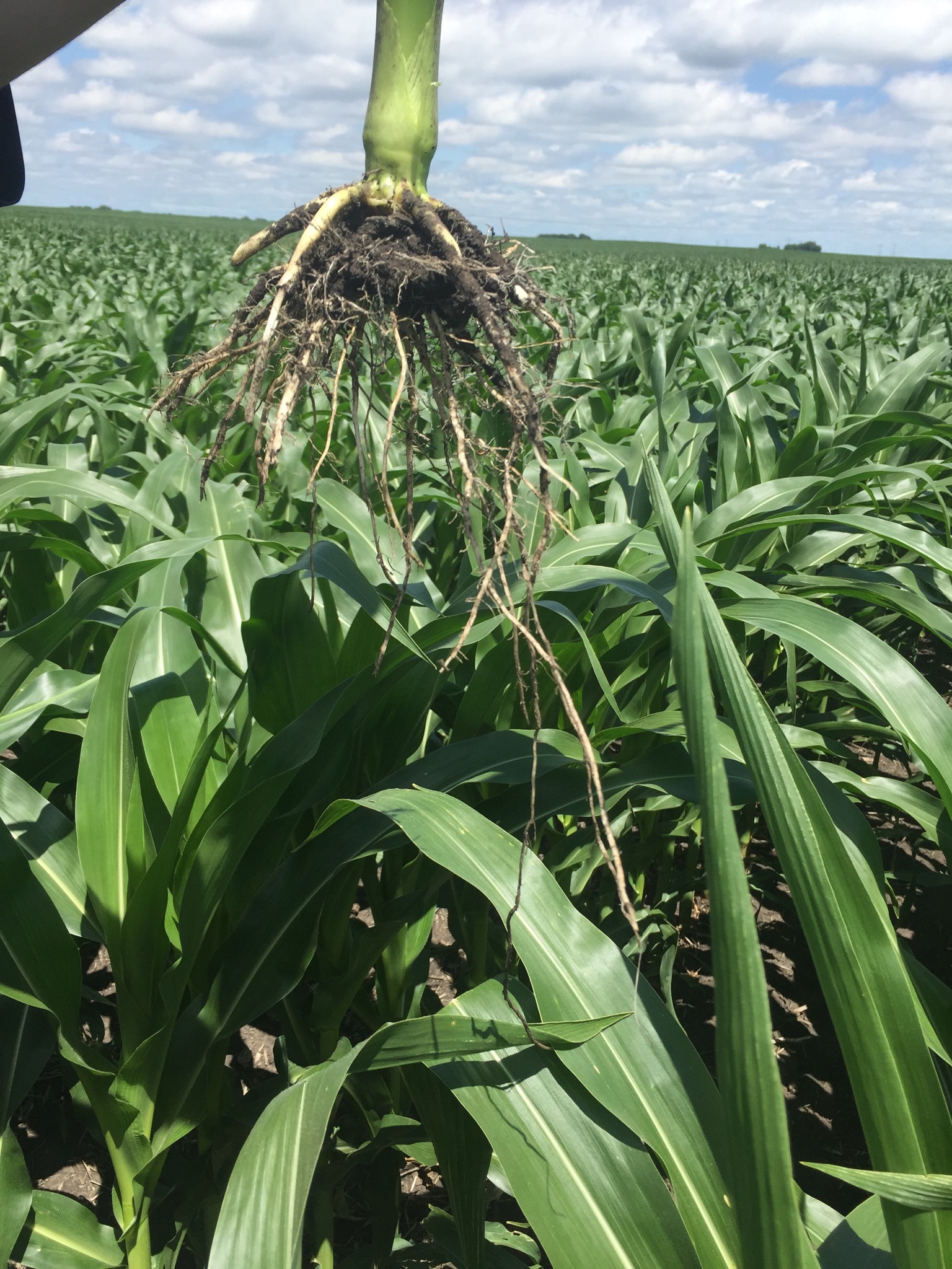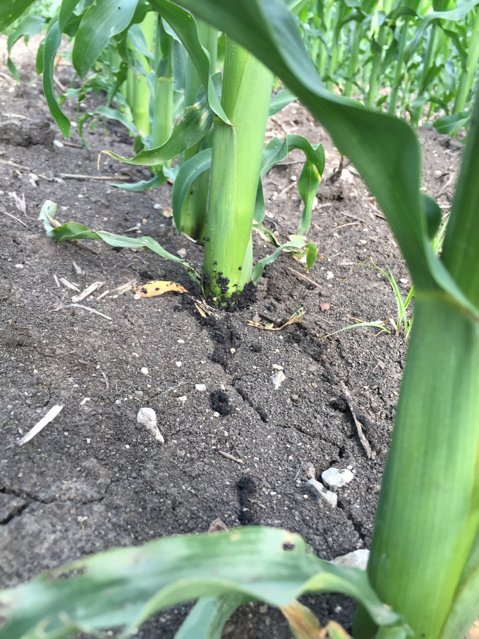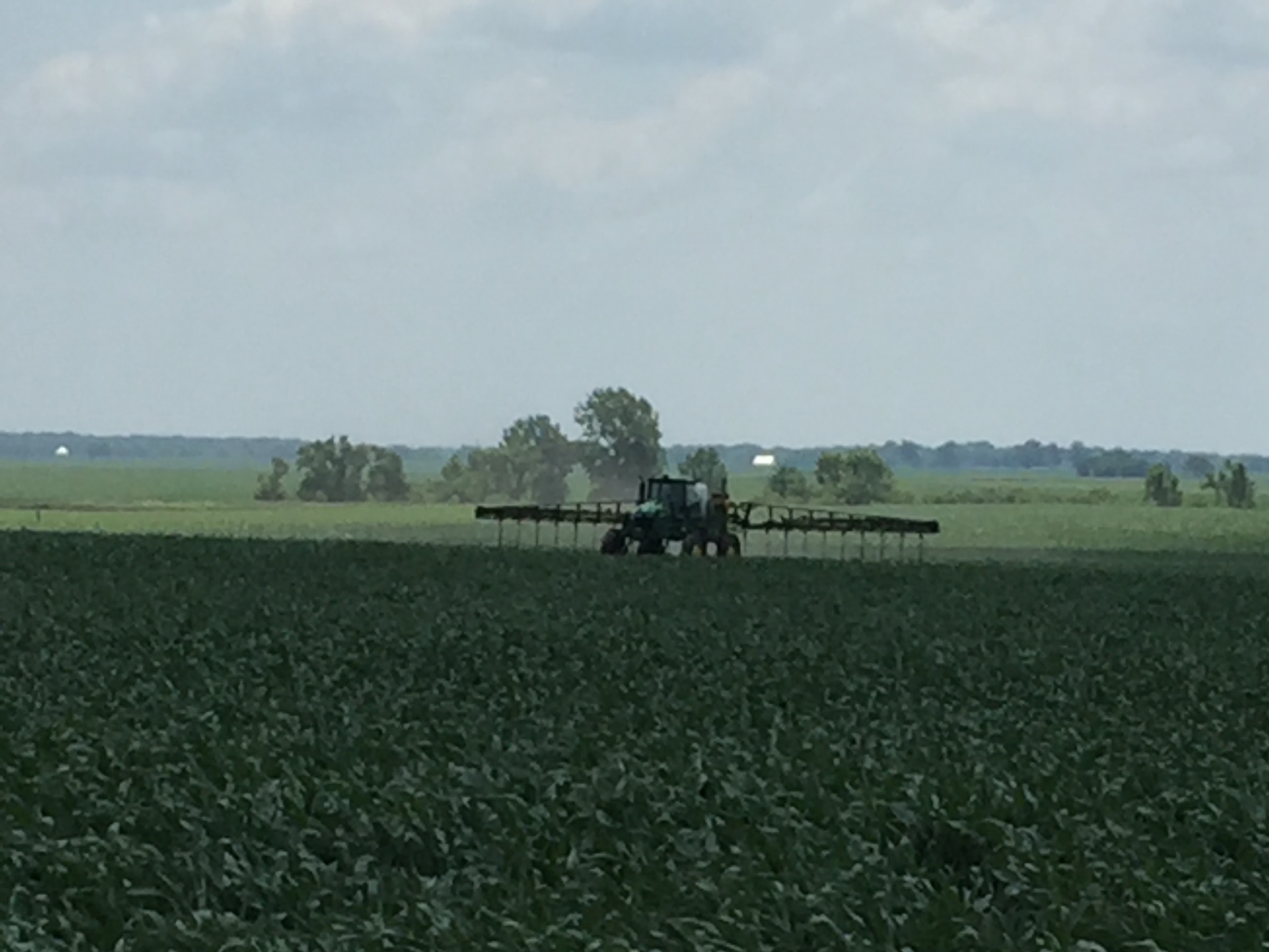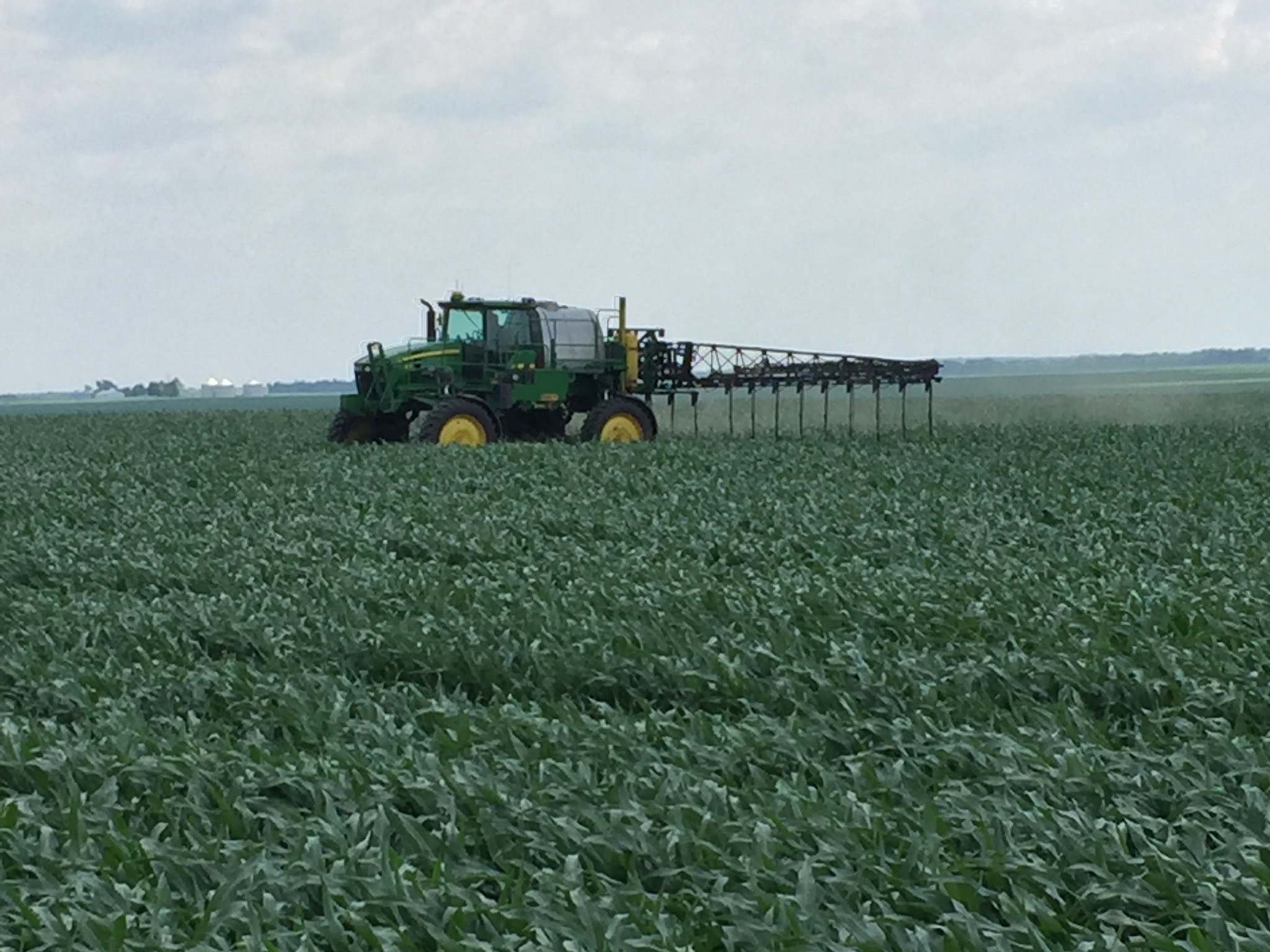 We again used the Y-Drop system mounted on the sprayer as shown in the pictures and videos below to apply our last application of nitrogen to the corn. It allows later application than other methods and precise placement directly at the base of the stalks (check out the slow-motion videos of the units placing the nitrogen). The timing and placement helps promote more efficient nitrogen usage an reduce risk off nitrogen loss. We were able to get it all applied before Tuesday’s rains. Although some fields only received 0.2″ of rain, the funneling effect of the corn plant directs the rain right to the base of the plant and allows the nitrogen to be taken into the soil and root zone with only such small amounts of rain.